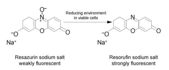 Measurement of metabolic activity. The measurement is performed by means of ubiquitous reducing agents in cells (NADH and NADPH) with of a vital probe (resazurin). Resazurin is reduced via the aerobic respiration of metabolically active cells, changing resazurin to resorufin, a reaction that fluoresces when exposed to green light.