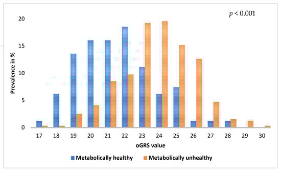 The mean value of optimized GRS (oGRS) was 21.4 (95% CI: 20.9–21.9) in the MHO group and 23.7 (95% CI: 23.5–23.9) in the MUO group. The distribution of the oGRS showed a significant difference (p < 0.001) between the two groups, and significantly higher oGRS values were observed in the MUO group compared to the MHO group (Figure 1).