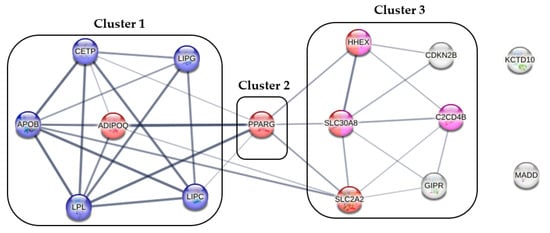 Based on the gene–gene interaction analysis, the fifteen genes identified can be grouped into three clusters. The first cluster contains five genes related to lipid metabolism (CETP, LIPG, APOB, LPL, and LIPC) and one gene related to glucose metabolism (ADIPOQ). The LPL and APIPOQ genes of this cluster are associated with obesity induced by the consumption of high-fat foods [30] and show a strong association with the PPARG gene, which forms the second cluster. The results of an experiment in rodents suggest that the expression pattern of the PPARG gene is associated with high fat intake, adipocyte development, and insulin resistance [31]. The direct effects of the ADIPOQ and PPARG genes on plasma lipid profile and adiponectin concentration, as well as their interaction with diet, have been demonstrated in humans [32]. Dietary habits influence the association of six genes (C2CD4B, CDKN2B, GIPR, HHEX, SLC2A2, and SLC30A8) forming the third cluster with diabetes, adipogenesis, and cardiovascular risk [33,34,35,36].