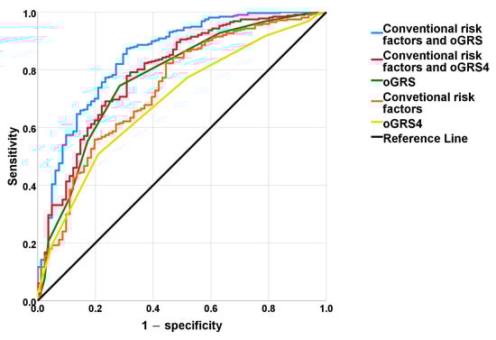 A combination of risk factors defined as conventional ones showed an overall discriminatory power of AUCconv. = 0.73 (95CI: 0.67–0.80). Conventional factors and oGRS4 together were as follows: AUCconv.+oGRS4 = 0.79 (95% CI: 0.74–0.85). Meanwhile, conventional and oGRS together were as follows: AUCconv.+oGRS = 0.85 (95% CI: 0.80–0.90). The combination of both oGRS4 (AUCconv. = 0.73 vs. AUCGRS4 = 0.79, ΔAUC = 0.059; p = 0.007) and oGRS (AUCconv. = 0.73 vs. AUCoGRS = 0.85, ΔAUC = 0.112; p <0.001) significantly improved the discrimination index compared to the one that only took into account the conventional risk factors (Figure 3).