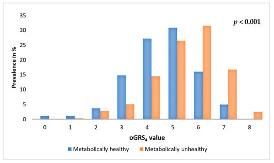 The distribution of oGRS4 showed a significant difference between the MHO and MUO groups (MHO = 4.47, 95% CI: 4.17–4.77 vs. MUO = 5.38, 95% CI: 5.24–5.53; p < 0.001; Figure 4) and a significant correlation with MUO risk according to adjusted logistic regression analysis (OR = 1.76, 95% CI: 1.43–2.17; p = 8.77 × 10−8).