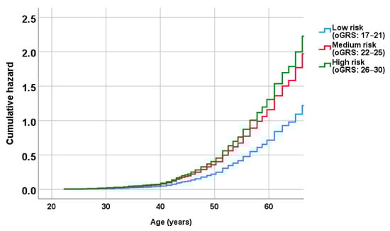 In the absence of knowledge of the exact time of MUO onset, Cox regression analyses were performed using the individuals’ age at the time that the questionnaire was recorded. Cox regression analysis showed that oGRS as a continuous variable was significantly associated with an increased risk of developing MUO earlier (hazard ratio (HR) = 1.10, 95% CI: 1.05–1.15; p < 0.001). Among the genetic risk categories based on the oGRS, both in the medium (HR = 1.62, 95% CI: 1.18–2.21; p = 0.002) and the high (HR = 1.83, 95% CI: 1.26–2.65; p = 0.001) risk groups the risk of developing MHO at a younger age was significantly higher compared to the low-risk group (Figure 5).
