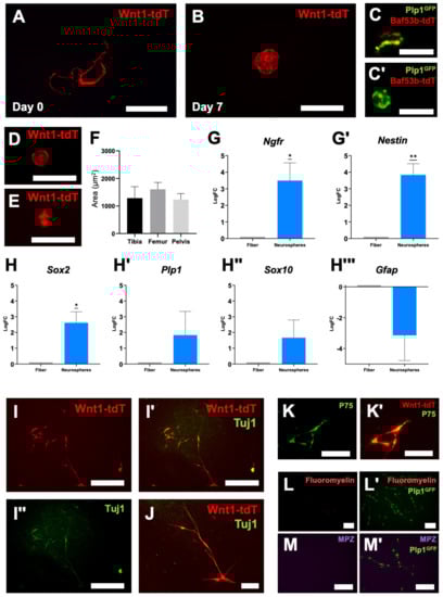 Neural crest-derived Schwann cells from bone marrow develop neural stem cell features in vitro. Expression of Wnt1-tdT in free-floating nerve fibers (A) from BM (day 0) and BM-neural stem cell (BM-NSC) neurospheres (B) in culture (day 7). Scale bars = 1 mm. Expression of Plp1GFP and Baf53b-tdT in free-floating nerve fibers (C) and BM-NSC neurospheres (C′) after 7 days in culture. Scale bars = 100 µm. Representative images of BM-NSC neurospheres generated from the pelvis (D) and tibia (E) of Wnt1-tdT+ mice. Scale bars = 200 µm. (F) Quantification of BM-NSC neurosphere size by source. One-way ANOVA with Welch’s correction (not statistically significant). Tibia, n = 7 independent cultures; Femur, n = 6 independent cultures; Pelvis, n = 3 independent cultures. (G,G′) Quantitative PCR of Ngfr (G) and nestin (G′) gene expression in NFBs and neurospheres. One-sample t-test to LogFC of 0, n = 7, * p < 0.05, ** p < 0.01. (H–H′′′) Quantitative PCR of Sox2 (H), Plp1 (H′), Sox10 (H′′) and Gfap (H′′′) gene expression in NFBs and neurospheres. One-sample t-test to LogFC of 0, * p < 0.05. Sox2 and Plp1, n = 5; Sox10, n = 7; Gfap, n = 6. (I–I′′) Representative images of Wnt1-tdT+ BM-NSCs cultured on fibronectin in monolayer conditions (I), merged images with Tuj1 expression (I′), and Tuj1 expression shown independently (I′′). Scale bar = 500 µm. (J) High magnification image of the above. Scale bar = 100 µm. (K,K′) Expression of P75 (K) in Wnt1-tdT+ BM-NSCs (K′). Scale bar = 50 µm. (L–M′) Representative images of FluoroMyelin (L) and MPZ expression (M) in Plp1GFP expressing BM-NSCs (L′,M′). Scale bars = 200 µm.
