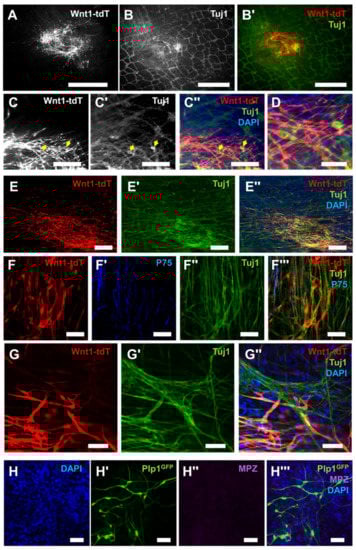- Joseph, N.M.; Mukouyama, Y.S.; Mosher, J.T.; Jaegle, M.; Crone, S.A.; Dormand, E.L.; Lee, K.F.; Meijer, D.; Anderson, D.J.; Morrison, S.J. Neural crest stem cells undergo multilineage differentiation in developing peripheral nerves to generate endoneurial fibroblasts in addition to Schwann cells. Development 2004, 131, 5599–5612. [Google Scholar] [CrossRef] [PubMed]