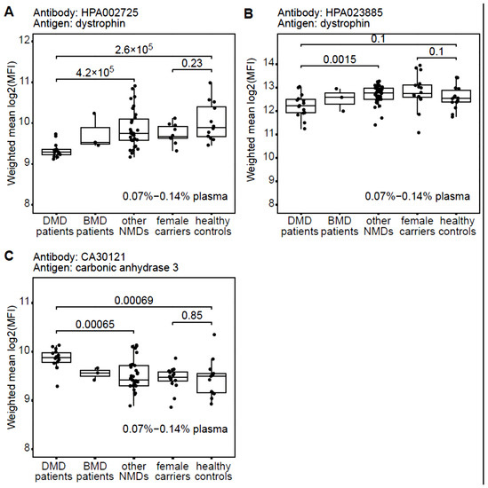 We designed an in-house suspension bead immunoassay as a proof-of-principle for investigating if DYS can be differentially detected in plasma from DMD patients compared to DMD carriers, healthy controls, and other neuromuscular disorders. Samples were tested at four different dilutions: 0.07%, 0.14%, 0.28%, and 0.56% of plasma to determine a detection range for the antibodies. This approach was selected because of the low volume of plasma needed for the assay and the availability of validated anti-DYS antibodies. Results showed that assays prepared at the highest concentration of plasma had the highest variation in non-specific background signal, negatively impacting reproducibility, as assessed through the coefficient of variation (%CV) of median fluorescent intensity (MFI) for positive and negative control beads. Therefore, to account for variation in assay preparation while maintaining low background, mean MFI was calculated across only the two lowest concentrations of plasma (two replicates at 0.07% and one replicate at 0.14%), as shown in Figure 1. The measurements had a coefficient of variation (CV) over replicates of around 10% for two of the three antibodies tested. HPA002725 had a CV of 8.9% (95% CI: 5.3% to 12.5%) over replicates and CA30121 had 11.2% (95% CI: 8.6% to 13.8%). In contrast, %CV over replicates for HPA023885 was 37.2% (95% CI: 31.8% to 42.7%). Mean MFI and the relative standard deviation, for each individual sample among the three antibodies and the empty beads assay, are shown in Supplementary Figure S1. Relative abundances of N-terminal DYS in plasma, as detected by HPA002725 (Figure 1A), was significantly lower in DMD patients compared to other groups (p-value < 0.05, Wilcoxon rank sum test). In contrast, there was a significantly lower level of C-terminal DYS, as detected by HPA023885, in DMD compared to other neuromuscular diseases, but not when comparing to healthy controls (Figure 1B). One explanation for this could be that the assay conditions tested are outside the linear detection range for HPA023885, which is further suggested by the high MFI obtained, the lack of linear relationship between different dilution conditions and high %CV. MFI values observed in healthy controls are quite divergent for both antibodies anti-DMD. In a recent plasma protein analysis, comprising 94 donors with no obvious symptoms, it was shown that each individual has a unique protein profile distinct from the profiles of other individuals [27]. To solve this limit it is necessary to perform several experiments in order to assess a range of predictivity, and maybe using multiple Abs anti-DMD to increase the test specificity. Relative abundance of CA3 was used as a positive control in this experiment as it has previously been shown by us to be elevated in both serum and plasma from DMD patients compared to healthy controls [28]. The antibody against CA3 showed, as expected, a significantly increased relative abundance in the DMD group compared to other groups (Figure 1C). CA3 is known to be a deterioration marker for type 1 muscle fibres [29] and thanks to its limited tissue expression, it appears more specific and sensitive than CK [30]. It was also demonstrated that it accumulates in blood as a consequence of muscle damage [29] and, for this reason, we cannot consider it a specific marker for DMD although it was observed be able to discriminate between DMD and healthy controls and between DMD and BMD [28].