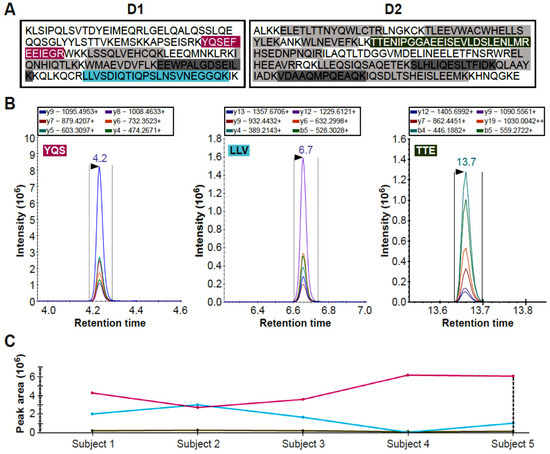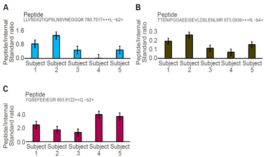 Tryptic peptides LLV and TTE are the lowest abundance peptides (Figure 3A,B), and they share the same expression profile with the only exception that LLV is not detected in one sample (Figure 3A). In contrast, the most abundant YQS tryptic peptide showed a different expression profile than LLV and TTE, among subjects (Figure 3C). Transition information used for quantitation is given with the tryptic peptide sequence for each graph (Supplementary Table S3).