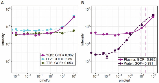 Calibration curves for the three peptides calculated using a 5-parameter logistic regression model. Panel (A) shows the standard curves of increasing peptide concentration over a wide range of 0.001–100 pmol/µL for each peptide detectable in control plasma. Panel (B) shows the standard curve of the optimal peptide YQS in plasma and water to show the matrix effect from plasma. Graphs are displayed with log10 axis, and each data point represents triplicate values.