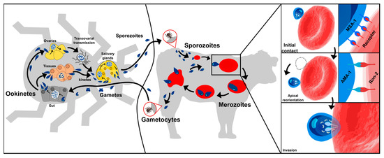 There has been controversy to date about the development of the pregametocytes within a vertebrate host’s bloodstream; there is no experimental evidence of this regarding B. bovis [8,11,12,13]. Nevertheless, when ticks feed on the blood forms, the male and the female gamete development begins in their gut lumen which fuse to form zygotes (known as the motile ookinetes) that invade the intestinal cells [13]. The motile ookinetes produce the kinetes (via meiotic division) which pass into the haemolymph and invade a vector’s peripheral tissues (including the salivary glands and the ovaries), thereby promoting transovarian and transstadial transmission. These two strategies are used by B. bovis for biological multiplication within the tick ovaries [14]. The kinetes become sporoblasts when they become dispersed to the salivary glands (i.e., asexual multiplication by sporogony), asynchronously producing 5000 to 10,000 Spz which are continuously released into a vertebrate host’s bloodstream when a tick is feeding [10]. Successful parasite invasion will depend on the use of its extracellular transmembrane proteins which interact with the host cell surface receptors, as in other Apicomplexa. However, the molecular mechanisms involved in the B. bovis life-cycle stages are yet to be fully understood.