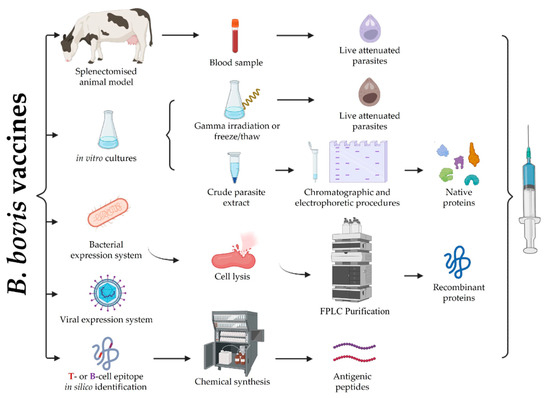 Resistance to drugs targeting B. bovis or its transmitting vector has made vaccination against this parasite the main infection control method [23]. The main vaccines developed and introduced in several countries for many years to date have involved using live attenuated parasites obtained from passages in splenectomised cattle (Figure 2) [24,25]. Other types of vaccine have also been studied, such as attenuated parasite-based vaccines obtained from in vitro cultures, or recombinant proteins/viral vectors or peptide-based vaccines targeting the B. bovis blood stage; however, these types of vaccines have only been used in scientific studies to date [23,26,27]. Even though these types of vaccines have induced considerable levels of protection (especially in calves under a year old), they have not been completely effective and the production-related difficulties have limited their commercialisation.