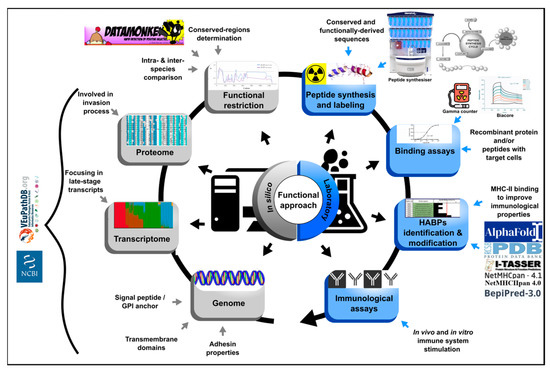 Functional approach strategy. Flow diagram describing the steps for prioritising in silico selection and laboratory experiments for identifying ideal vaccine component peptides. The strategy involves identifying the entire gene repertoire (using genome, transcriptome and proteome data mining) and their encoding sequence analysis by bioinformatics tools based on in silico characteristics and their intra (from 5 genomes)- and inter-species (phylogenetically related) conservation level [73]. Peptides encoded by regions under functional constraint are then chemically synthesised and target cell binding activity must be tested by radio-iodination-based peptide-cell interaction and competition assays [22]. Identified HABPs must be evaluated in in vitro culture and then modified to fit inside MHC-II to evaluate their role as vaccine component in in vivo tests in the pertinent experimental model. The figure shows the required resources for carrying out the functional approach.