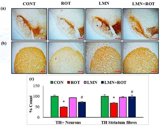 To investigate the effect of LMN on ROT-induced alterations in the nigrostriatal system in rats, the loss of dopaminergic neurons was detected by staining the TH-ir neurons and their corresponding fibers in the striatum. Immunohistochemistry of TH assessed the presence of TH-ir dopaminergic neurons in the SN and TH-ir dopaminergic striatal fibers. ROT-injected rats showed a significant (p < 0.05) reduced number of TH-positive cells in the SN and a reduced density of striatal TH-ir fibers (Figure 2). LMN treatment to ROT-injected rats decreased the loss of TH-positive neurons, evidenced by the increased number of dopaminergic neurons in SN and TH-ir fibers in striatum. In the normal-control- and LMN-treated groups, the SN contained large numbers of TH-immunopositive neurons along with dopaminergic content in the striatum. This suggests that LMN treatment can reduce the loss of dopaminergic neurons caused by ROT (Figure 2).