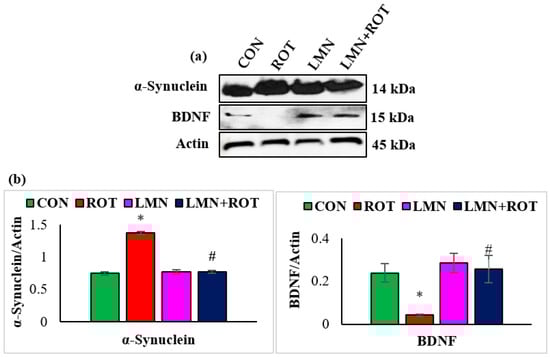 Representative images of Western blots and densitometric analysis for BDNF and α-synuclein expressions in the striatal tissues (a,b). Immunoblotting was performed in duplicates and the data are expressed as the mean ± SEM. * p < 0.05 CON vs. ROT; # p < 0.05 ROT vs. LMN + ROT (one-way ANOVA followed by DMRT). CON: normal control, ROT: rotenone, LMN: limonene, LMN + ROT: limonene and rotenone treatment.