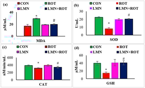 Effect of limonene on the levels of MDA, SOD, catalase (CAT), and GSH in the midbrain of rats (a–d). The values are presented as mean ± SEM (n = 6–8); * p < 0.05 CON vs. ROT; # p < 0.05 ROT vs. LMN + ROT (one-way ANOVA followed by DMRT). CON: normal control, ROT: rotenone, LMN: limonene, LMN + ROT: limonene and rotenone treatment.