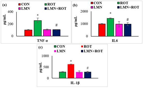 Neuroinflammation is considered one of the key pathogenic events that plays a role in the progression of neurodegeneration. Therefore, we investigated the effect of LMN on ROT-induced neuroinflammation by measuring the levels of the proinflammatory cytokines (TNF-α, IL-1β, and IL-6) in the midbrain of rats. ROT injection to the rats caused a considerable (p < 0.05) rise in the levels of TNF-α, IL-1β, and IL-6 in the midbrain compared to normal control rats (Figure 5), whereas treatment with LMN produced a significant (p < 0.05) reduction in the levels of these proinflammatory cytokines in the midbrain compared to only ROT-injected rats (Figure 5).