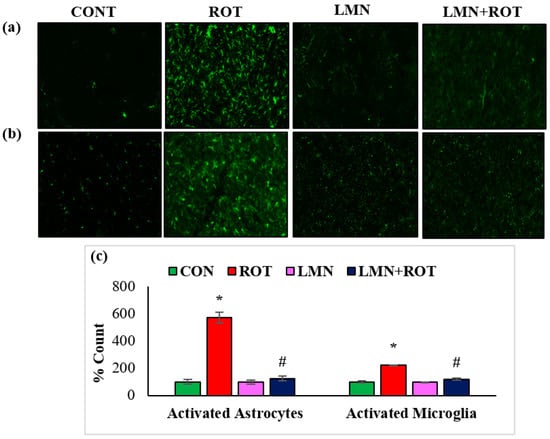 The activation of GFAP and Iba-1 in striatum was explored by immunofluorescence staining of striatum. A remarkable expression of activated astrocytes (GFAP-positive) (a), and microglia (Iba-1-positive) (b), was indicated in the fluorescent images taken from ROT-injected rats when compared to the control rats. (c), The quantitative analysis of the number of activated astrocytes and microglia is shown. Each group consists of three rats and the values are presented as mean ± SEM; * p < 0.05 CON vs. ROT; # p < 0.05 ROT vs. LMN + ROT (one-way ANOVA followed by DMRT). CON: normal control, ROT: rotenone, LMN: limonene, LMN + ROT: limonene and rotenone treatment.