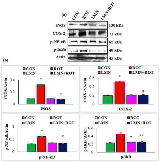 Immunoblotting analysis and quantification of iNOS, COX-2, and p-NF-κB in the striatal tissues of rats (a,b). Immunoblotting was performed in duplicate and the results are presented as mean ± SEM. * p < 0.05 CON vs. ROT; # p < 0.05 ROT vs. LMN + ROT (one-way ANOVA followed by DMRT). CON: normal control, ROT: rotenone, LMN: limonene, LMN + ROT: limonene and rotenone treatment.