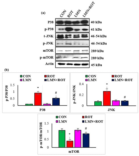 To confirm whether LMN regulates the role of the P38 MAPK and mTOR signaling pathways in PD induction, we further investigated p-JNK, p-p38, and p-mTOR activation in different experimental groups. Phosphorylation of JNK and P38 was significantly (p < 0.05) increased in ROT-injected rats in comparison with normal control rats (Figure 8), whereas LMN treatment to ROT-injected rats produced a significant (p < 0.05) reduction in the phosphorylation of MAPK proteins when compared to only ROT injected rats. Phosphorylated mTOR was downregulated in ROT-injected rats, whereas LMN treatment for ROT-injected rats restored normal expression. Both normal-control-, and LMN-alone-treated rats had no notable change in the expression of these phosphorylated MAPK signaling proteins (Figure 8).