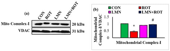 Western immunoblotting and densitometric analysis on the protein expression of mitochondrial complex-I in the striatal tissues of rats (a,b). Immunoblotting was performed in duplicate and the values are presented as mean ± SEM. * p < 0.05 CON vs. ROT; # p < 0.05 ROT vs. LMN + ROT (one-way ANOVA followed by DMRT). CON: normal control, ROT: rotenone, LMN: limonene, LMN + ROT: limonene and rotenone treatment.