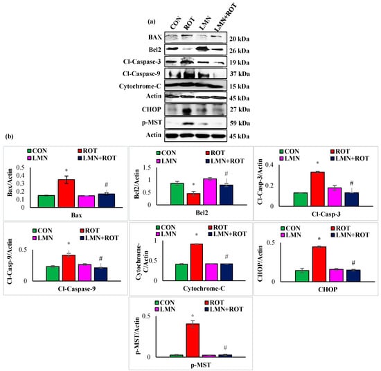 Immunoblotting and densitometric analysis of Bcl2. Antiapoptotic protein and pro-apoptotic proteins, including Bax, cytochrome-C, cleaved caspase-3, cleaved caspase-9, CHOP, p-MST were evaluated in the striatum (a,b). Immunoblotting was performed in duplicate and the data are presented as mean ± SEM. * p < 0.05 CON vs. ROT; # p < 0.05 ROT vs. LMN + ROT (one-way ANOVA followed by DMRT). CON: normal control, ROT: rotenone, LMN: limonene, LMN + ROT: limonene and rotenone treatment.