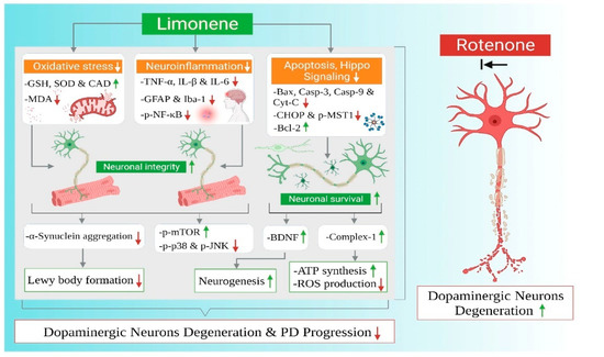 Summarized mechanisms of neuroprotective effect of limonene in experimental model of Parkinson’s disease.