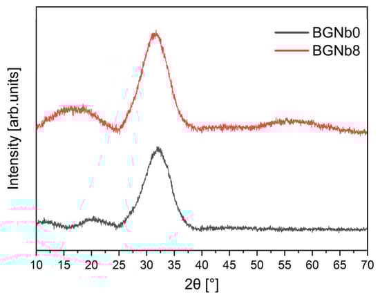 XRD patterns of 45S5 bioglass samples modified by the insertion of 0 and 8 mol% of Nb2O5.