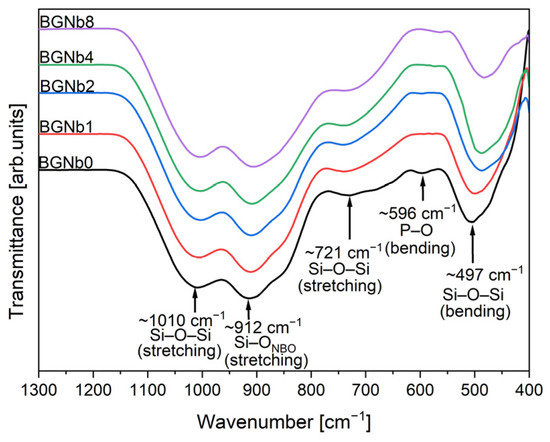 FTIR spectra of bioactive glasses modified by Nb2O5 insertion.