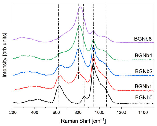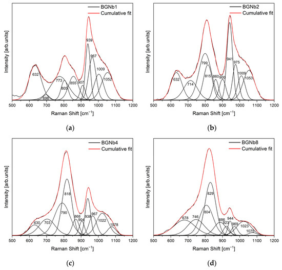Figure 3 shows the Raman spectra of the bioactive glasses prepared. For a more detailed analysis, the Raman spectra of BGNb1, BGNb2, BGNb4, and BGNb8 were deconvolved by a Gaussian fitting (Figure 4).