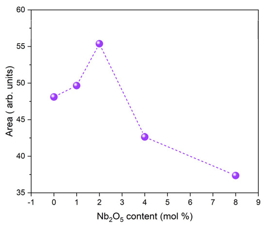 The sum of the area of Raman vibration bands associated with non-bridging oxygen ions is plotted in Figure 5 as a function of Nb2O5 concentration. An increase in the number of NBOs for the bioglass with Nb2O5 content up to 2 mol% can be observed, indicating the existence of an optimal amount of Nb2O5 that can be added to the base bioglass.