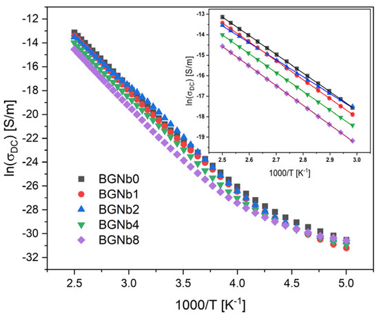 Figure 7 depicts the DC conductivity versus 1000/T on a logarithmic scale. It is visible that the conductivity rises with the increase in the temperature, which should be related to the increased mobility of the charge carriers. For temperatures above 300 K, approximately, this variation becomes linear, indicating that the Arrhenius formalism may be used to evaluate the activation energy associated with this thermally activated process. The calculated activation energy at the high-temperature region (inset in Figure 7) for all samples is registered in Table 2. The activation energy (Ea (DC)) decreases with the increase in Nb2O5 concentration, reaching a minimum value at the value of 2 mol%. After, a reversing trend is observed. This behavior is similar to the one observed for the NBO ions amount (Figure 5). On the contrary, an opposite trend was observed for the DC conductivity (σDC), which shows a maximum value for the sample with 2 mol% of Nb2O5.