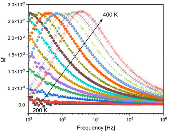 The dielectric properties of the samples were analyzed using the modulus formalism, (M* = 1/ε*), to minimize the effect of electrode polarization and conductivity. Figure 8 shows the presence of one dielectric relaxation which is shifted to higher frequencies with increasing the temperature. It should be noted that other formalisms, such as permittivity or impedance, did not exhibit this dielectric relaxation behavior. Therefore, the observed relaxation behavior should be associated with an intrinsic characteristic related to dipole formation between the network modifier ions and the non-bridging oxygen ions.