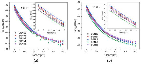 The AC conductivity (Figure 9) showed the same feature, in resonance with DC conductivity, where the variation increases linearly in the high-temperature region. The results obtained for AC conductivity are registered in Table 2 and show an agreement with DC conductivity results. The bioglass with 2 mol% Nb2O5 content exhibits the highest AC conductivity. The activation energy value decreases with increasing frequency for all bioglass samples. This can be explained due to the increase in the applied frequency which enhances the electronic jumps between the localized states [66,67].