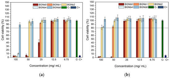 The human osteosarcoma Saos-2 cells were used to evaluate the cytotoxicity of the bioactive glasses prepared. Two sets of samples were tested, which we call the non-passivated and the passivated ones. The difference between the two sets is that the non-passivated is the filtered solution of the pristine bioglass powders that were in contact with the McCoy 5A medium for 24 h. The passivated solution was achieved by changing the medium after 24 h to a new medium, which was kept in contact with the powders for a new 24 h period. The filtered solution was then called the passivated sample. Figure 10 displays the results obtained for the passivated and non-passivated samples. All samples showed an improvement in cell viability when the concentration decreased from 100 mg/mL to 6.75 mg/ mL, as expected. Moreover, it can be seen that the passivated samples exhibit higher cell viability compared to the non-passivated samples. The passivated samples, which better simulate physiological conditions [68], revealed cell viability higher than 80%, except for the BGNb0 and BGNb1 samples that showed toxicity at the 100 mg/mL concentration and BGNb0 at 50 mg/mL, respectively.