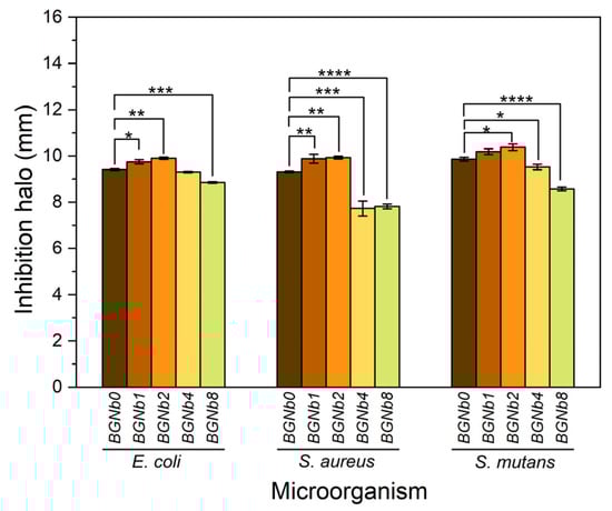 Antibacterial activity of the bioglass samples against E. coli, S. aureus, and S. mutans based on inhibition halo. Results are reported as mean ± SD. The asterisks indicate significance in an unpaired t-test; * p ≤ 0.05; ** p ≤ 0.01; *** p ≤ 0.001; **** p ≤ 0.0001.