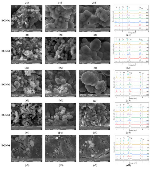 SEM micrographs of five groups of bioactive glass samples modified by the insertion of different percentages of Nb2O5 after immersion in SBF for (a1–a5) 24 h; (b1–b5) 14 d; (c1–c5) 28 d; (d1–d5) plots of the EDS analysis for all immersion times. (The magnification of SEM images is 10 kX).