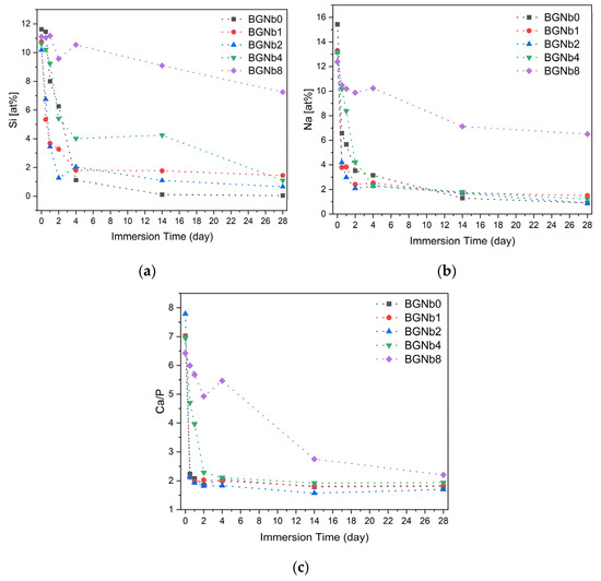 The variation of Si and Na atomic percentage and the Ca/P ratio, determined using the data from EDS analysis on the surface of the bioglass samples before and after immersion in SBF solution, are illustrated in Figure 13. An abrupt drop in the atomic percentage of the elements is evident during the initial 2 days of immersion in all samples while no significant change is observed afterward. The samples with lower percentages of niobium, BGNb1, and BGNb2, show a faster decrease in Na and Si percentage in the first 2 d compared to the other glasses, and the value of the Ca/P ratio decreases reaching a value of 1.60–1.80, comparable to that of hydroxyapatite (Ca/P = 1.67) [69,70,71]. The decrease in the atomic percentage of Na and Si in the sample modified with 8 mol% of Nb2O5 is not significant, in contrast with the other samples, and the Ca/P ratio is considered high.