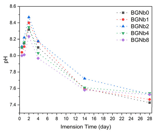 The variation in the pH is indicated in Figure 14. The increase in the pH in the first 48 h was due to the high release of the alkaline metal ions from the bioglass surface, and then it decreases due to the formation of silanol. The incorporation of 2 mol % of niobium into the bioglass resulted in a higher value of pH, which can be explained by the highest degradation rate of this sample and this is consistent with the condition of the creation of an HA-like layer on the surface of the bioactive glass with higher crystallinity [59,72].