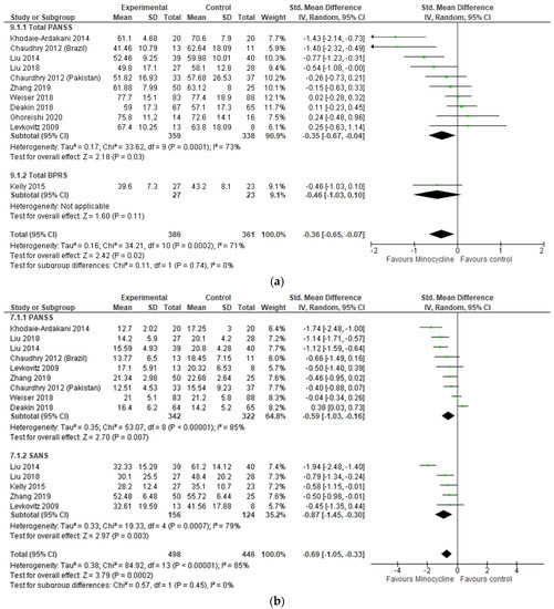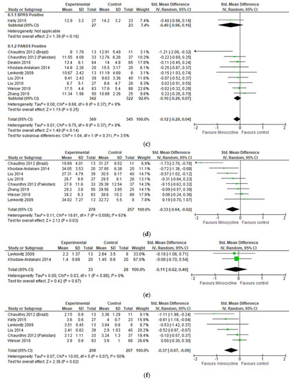 Studies examining psychiatric disorders have been examined in two ways: results related to clinical symptoms (e.g., depressive symptoms) were grouped according to primary diagnosis (i.e., schizophrenia, major depressive disorder, bipolar disorder, etc.) while cognitive outcomes were grouped according to the National Institute of Mental Health’s Measurement and Treatment Research to Improve Cognition in Schizophrenia—Consensus Cognitive Battery (MATRICS-CCB) cognitive domains [36]. All outcomes were compared between groups (minocycline and controls) at follow-up. Some scores have been reversed to ensure uniformity of forest plots (i.e., all effects to the left favor minocycline). Where a single study used multiple methods of scoring a single outcome, results were pooled, and the study was noted as having a combined outcome. If a study reported heterogeneous samples that were otherwise treated identically (i.e., different countries or severity of symptoms), these samples were included as separate entries within the meta-analyses.