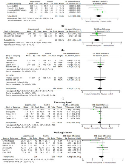 Meta-analysis results for schizophrenia. (a) Total symptoms; (b) Negative symptoms; (c) Positive symptoms; (d) General symptoms; (e) Extrapyramidal symptoms; (f) CGI; (g) GAF; (h) AIMS; (i) Depressive symptoms; and (j) Cognitive function: processing speed, working memory, psychomotor speed, executive functions, problem-solving, verbal learning, visual learning [37,38,39,40,41,42,43,44,45,46].