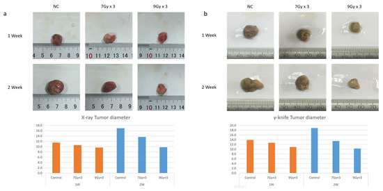 For experiments in vivo, an X-ray accelerator (Clinac 23EX, Varian Medical Systems, Inc., Palo Alto, CA, USA) was utilized to deliver radiation at a dose rate of 400 MU/min. The irradiation conditions were as follows: 6MV, distance (SSD) 96.1 cm. For the imitation of the clinical SBRT condition, the dose was 7Gy/9Gy × 3 fraction.