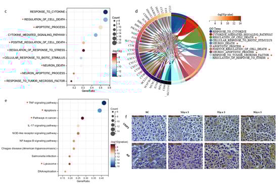 First, IR treatment was applied to rats bearing an orthotopic tumor in the liver. Compared to the control group, tumor growth was significantly inhibited in IR treatment groups, and this effect was more obvious when the dose was added to 9 Gy × 3 fraction (Figure 1a,b; Supplementary Figure S1). Then, to further detect the mechanism of tumor inhibition induced by IR, transcriptome sequencing was conducted. The most significantly increased genes were collected. Biological process (BP) enrichment analysis showed that the up-regulated genes after IR were highly related with cell death, especially apoptosis (Figure 1c,d). In addition, with KEGG enrichment analysis, apoptosis and the TNF pathway seemed to be closely related to these genes (Figure 1e). Consistently, immunohistochemical (IHC) staining showed positive results of Caspase3 and the apoptosis-inducing factor (AIF) after IR, which confirmed the occurrence of apoptosis (Figure 1f).