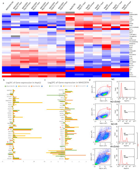 Due to the non-homology between human and rat models [29], to further confirm the change of genes in HCC cells, a PCR array was performed on MHCC97H and HepG2 cell lines focusing on collected genes from in vivo experiment (Figure 2a–c, Attachment File 1). As transcription always happens earlier than translation, we examined the cell lines at 1 and 6 h after IR, and a PCR array was conducted expression profiles were established. The genes expressed consistently with in vivo sequencing results were found (Figure 2b,c). Meanwhile, trypan blue staining flow cytometry verified cell death after IR. Inhibitors of apoptosis, ferroptosis, necrosis, and autophagy pretreatment were applied to HCC cells, and IR-induced cell death was found to be reversed by the pretreatment of ZVAD (commonly used as an apoptosis inhibitor). With the pretreatment of ZVAD, the value of the MHCC97H cell death signal peak was significantly reduced after IR (Figure 2d right), while in other groups, the rescue effect was not evident (Supplementary Figure S2A). Previous results had already informed us of the involved genes in vivo (Figure 1c–e). After filtering out genes expressed inconsistently with the in vivo results or those already well-reported [22,30,31,32], we mainly focused on CTSD, CTSH and FAS (marked with * in Figure 2b,c; Supplementary Figure S2B). Then, due to the low abundance of FAS and the inconsistency of CTSD expression (Figure 2e; Supplementary Figure S2C), we abandoned FAS, CTSD and selected CTSH for further study.