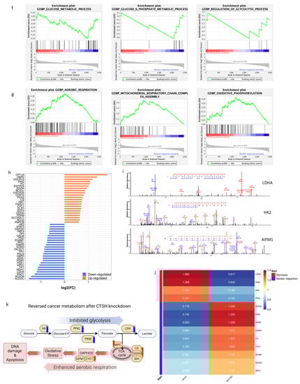 To further understand how CTSH performs in regulating HCC metabolism and radiation resistance, proteome mass spectrometry (MS) was performed. As the MS results showed, 360 proteins were up-regulated and 430 were down-regulated after CTSH knockdown (Figure 3a,b). Further enrichment analysis showed the up-regulated proteins mainly localized in the mitochondria (Figure 3c). In addition, these up-regulated proteins were related to mitochondrial function and aerobic respiration, while the down-regulated ones were associated with biosynthesis and metabolic processes (Figure 3d,e). As mitochondria are known to play an important role in metabolism and apoptosis [33] and the cancer metabolic switch is important for cancer cell fate [34], we wondered whether CTSH was affecting cell fate by regulating the metabolic switch. Remarkably, more detailed GSEA results confirmed our hypothesis; after CTSH knockdown, the glycolytic metabolism was inhibited, while the aerobic respiration was promoted (Figure 3f,g). Important molecules for glycolysis such as HK2, PFKL, PKM, and LDHA were all down-regulated. Furthermore, key factors of the tricarboxylic acid cycle (TCA), such as CS, OGDH, and IDH, and oxidative phosphorylation (OXPHOS)-promoting factors, such as AIFM1 and CYC1, were up-regulated (Figure 3h–j). At the same time, mitochondrion pyruvate carrier MPC1 increased, indicating an increase in mitochondria pyruvate intake. Thus, enhanced TCA and OXPHOS formed a strong up-regulation of the aerobic respiration cascade (Figure 3h–j). Considering the reported association of glycolysis with radioresistance, the above results indicate that CTSH knockdown inhibited the radioresistance of HepG2 cells by perturbing glycolysis and reversing the cancer metabolism to aerobic respiration (Figure 3k).