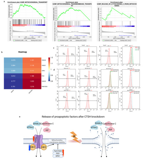 Apoptosis includes intrinsic (mitochondrial) and extrinsic (death receptor) mechanisms. As previous results had suggested the involvement of mitochondrial genes (Figure 3d,e and Figure 4c,d), we decided to focus on mitochondrial dysfunction and apoptosis for further study. Remarkably, the GSEA results showed an increased cascade of the transmembrane transport of mitochondria and cytochrome c release (Figure 5a). Among those, VDAC formed a channel through the mitochondrial outer membrane and allowed the diffusion of hydrophilic molecules. It opened at low or zero membrane potential and closed at potentials above 30–40 mV [42]. Fam162A, FIS1, and OPA1 were reported to be involved in proapoptotic factor release (such as cytochrome c), caspase activation (such as CASP9), and mitochondrial permeability transition induction [43,44,45]. Interestingly, after CTSH knockdown, all these genes were up-regulated (Figure 5b). Besides glycolysis, HK2 also plays a role in maintaining the integrity of the outer mitochondrial membrane and preventing the release of apoptogenic molecules from the intermembrane space and subsequent apoptosis [33]. In cancer cells, it binds to and inhibits VDAC to suppress mitochondrial function while stimulating glycolysis [46], and it has also been observed to be down-regulated (Figure 3j). All these results indicated an increase in the permeability and instability of the mitochondrial membrane. Mitochondrial membrane potential (MMP) examination after IR further confirmed the participation of these molecules (Figure 5c,d); a decrease in MMP (IR-induced) and membrane stability (CTSH KD−induced) made it easier for molecules to be released from the mitochondria after IR, thus promoting the apoptotic process. The above results suggested an explanation responsible for the increased apoptotic flux; CTSH knockdown promoted the release of some proapoptotic factors after IR through modulating the permeability and stability of the mitochondrial membrane (Figure 5e).