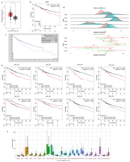 Then, to verify the potential of CTSH in clinical application, a series of bioinformatic analyses were performed using well-known databases. For the mRNA level, CTSH showed significantly higher expression in HCC than non-tumor samples (Figure 6a) (derived from GEPIA). In addition, in a clinical cohort of 370 HCC patients, using a validated mRNA signature, higher CTSH signaling was associated with poor prognosis (p-value = 0.025) (Figure 6b) (derived from Kaplan–Meier plotter). A survival Kaplan–Meier (KM) analysis of 365 patients showed similar results in the CTSH protein level (Figure 6c) (from The Human Protein Atlas). A multi-gene expression comparison of CTSH targets, especially those glycolysis-related genes, showed homogeneous trends related to tumorigenesis (Figure 6d) (from TNMplot). Furthermore, by combining CTSH expression and its downstream targets expressions (i.e., CTSH combined with PFKL, PKM, LDHA, HK2; and low IDH, MPC1, AIFM1, and HTRA2 combined with high CTSH expression), we found a remarkably significant facilitation of tumorigenesis and poor prognosis in HCC (Figure 6e) (Kaplan–Meier plotter). Then, to verify the universality of the above findings, profiles of CTSH expression were drawn out using two different databases (Figure 6f and Figure S4A) (TNMplot and GEPIA). Among them, human malignancies were selected because of their high CTSH tumor expression. Remarkably, CTSH was related with poor prognosis in all these cancers (Figure 6g). Furthermore, survival KM plotting showed consistent facilitations of poor prognosis in malignancies such as cervical squamous-cell carcinoma, esophageal carcinoma, and pancreatic adenocarcinoma (Figure 6h,i and Figure S4B,C) (Kaplan–Meier plotter). However, in other low-grade malignancies, this relationship seems insignificant or even reversed (Supplementary Figure S4D). Taken together, these findings implied significant therapeutic and diagnostic potential for clinical use.