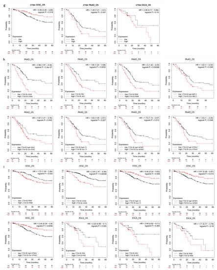 CTSH and Its Targets Were Correlated with Tumorigenesis and Poor Prognosis. (a) Expression of CTSH gene in HCC tumor and normal tissues by GEPIA; (b) Kaplan–Meier survival plot of CTSH gene expression of HCC by Kaplan–Meier Plotter; (c) Survival plot of CTSH protein expression between high and low level analyzed by The Human Protein Atlas; (d) Multi-gene expression analysis of CTSH with its downstream targets by TNMplot; (e) Survival plot of CTSH gene combined with its targets’ expression in HCC; (f) Expression profile of CTSH between tumor and normal tissues in human cancers; (g) Survival plot of CTSH gene in cervical squamous-cell carcinoma (CESC), pancreatic adenocarcinoma (PAAD), and esophageal squamous-cell carcinoma (ESCA); (h,i) Survival plot of CTSH combined with its targets’ expression in the above cancers; * p < 0.1; *** p < 0.01.