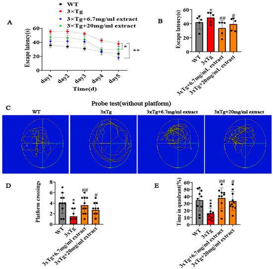 The potential of the extract of A. annua was obtained via different techniques (refer to Section 2) to improve the cognitive functions of 3xTg AD mice was assessed by Morris Water Maze (MWM) test. All mice were randomly divided into four groups: WT ctrl, 3xTg ctrl, the 20 mg/mL group and the 6.7 mg/mL group. After AD-type mice were treated different with concentrations of extract, except controls, which were treated with an equal volume of water, we found that the mice in the treatment groups performed better in the Morris water maze compared with 3xTg AD mice, as shown in Figure 1. Specifically, treated animals exhibited significant reductions in the escape latency (Figure 1A,B), denoting an improvement of their cognitive functions. Importantly, the escape latency of treated animals was similar to WT animals from the control group. A. annua extract treatment also promoted a significant increase in the number of platform crossings and of the percentage of time spent on the target quadrant (Figure 1C–E). These findings are indicative of the potential of extract to recover the learning and memory deficits of the mice in the 3xTg AD experimental model.