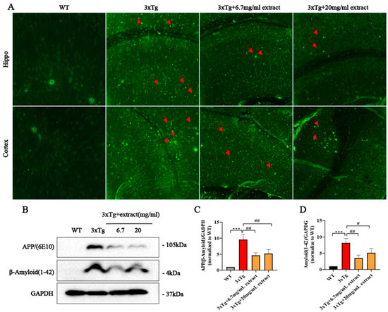 2.2. A. annua Extract Reduced Aβ Accumulation in 3xTg AD Mice