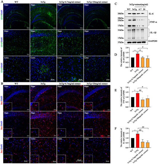 Increasing evidence suggests that the occurrence of neuroinflammatory alterations, such as chronic microgliosis and astrogliosis, are crucial contributors to the progression of AD pathology [34,35]. Therefore, we evaluated the expression of Glial fibrillary acidic protein (GFAP, astrocytes marker) and Iba-1 (microglia marker) in the hippocampus and cortex. The obtained results indicate that the expression of GFAP was significantly increased in 3xTg AD mice in comparison with WT mice, being significantly reduced by extract treatment (Figure 4A). Likewise, untreated 3xTg AD mice exhibited higher Iba-1 expression levels compared with WT mice, being reduced in both the 6.7 mg/mL and 20 mg/mL treatment groups (Figure 4B). To further support these findings, the levels of IL-6, TNF-α and IL-1β were assessed by western blot. Compared with untreated 3xTg AD, mice in both the 6.7 mg/mL and 20 mg/mL treatment groups showed a significant reduction of the expression levels of these inflammatory factors (Figure 4C–F).