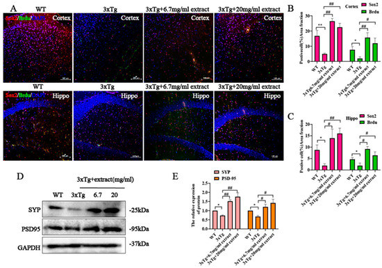 Evidence suggests the occurrence of neurogenesis impairments in the AD. The decline of adult neurogenesis that accompanies AD progression has been associated with an aggravation of the cognitive deficits and its upregulation has been shown to improve cognition [36]. Hence, the development of treatments able to enhance neurogenesis are a potential therapeutic approach to be used in the treatment of AD. Immunofluorescence double-labeling of neuronal progenitor cells (NPs) with Sox2 and Brdu (marker of proliferative cells) in the cortex and hypothalamus showed a significative reduction of the number of Sox2+ and Brdu+ positive cells in 3xTg AD mice compared with WT control animals (Figure 5A). In contrast, 3xTg AD mice treated with extract exhibited a significative higher number of Sox2+and Brdu+-positive cells in the same brain areas (Figure 5A). Additionally, the number of Sox2+ and Brdu+-positive cells was determined compared with untreated 3xTg AD mice; treated mice exhibited significant increased numbers of Sox2+ and Brdu+ positive cells in both the 6.7 mg/mL and 20 mg/mL treatment groups (Figure 5B,C), indicating that extract promoted the survival and proliferation of NPs in 3xTg AD mice. Further investigation of the effect of extract in the dendritic loss exhibited by 3xTg AD mice showed that both 6.7 mg/mL and 20 mg/mL doses of extract treatment promoted the upregulation of synapse-related protein expression levels (Figure 5D,E), indicating that extract rescued the dendritic loss in the brains of 3xTg AD mice.