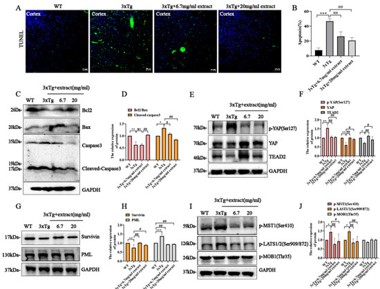 Multiple evidence indicates that the Hippo signaling pathway plays a critical role in neurodegeneration disease [37]. Moreover, in a recent study, YAP was also implicated as a hub molecule in AD pathology [38]. Assessment of the effect of extract in the neuronal apoptosis of AD mice by TUNEL staining assay indicates that the increased number of apoptotic cortical neurons in 3xTg AD mice was significantly decreased by extract treatment (Figure 6A,B). These alterations were accompanied by changes in the expression of different apoptosis regulators including Bax, Bcl-2 and cleaved caspase 3 (Figure 6C). Specifically, extract promoted the increase in Bcl-2/Bax ratio and the decrease in cleaved caspase 3 expression (Figure 6D). Previous studies indicate the involvement of the Hippo signaling in the inhibition of apoptosis. Activation of the Hippo signaling pathway triggers the functional inactivation of YAP, promoting the occurrence of cellular apoptosis [14,36]. Accordingly, the expression levels of YAP and TEAD2 were significantly increased in treated 3xTg AD mice compared with untreated 3xTg AD animals, while YAP phosphorylation levels were significantly decreased by extract treatment (Figure 6E,F). Previous studies suggest that YAP interaction with TEAD transcription factors may result in the upregulation of anti-apoptotic genes such as Survivin [39,40,41] On the other hand, phosphorylated YAP may also bind to p73, promoting the upregulation of pro-apoptotic genes such as bax and promyelocytic leukemia (PML) [42,43]. In this study, extract treatment promoted a significant increase in Survivin expression levels while significantly reducing the expression of PML (Figure 6G,H). In addition, the proteins levels of upstream p-MST1(Ser410) and p-LATS1/2(Ser909/872) of the YAP signaling cascade were significantly decreased by extract treatment, while p-MOB1(Thr35) expression was not significantly altered (Figure 6I,J). These results indicate that extract reduction of brain neuronal apoptosis may occur via YAP/TEAD2/Survivin signaling.